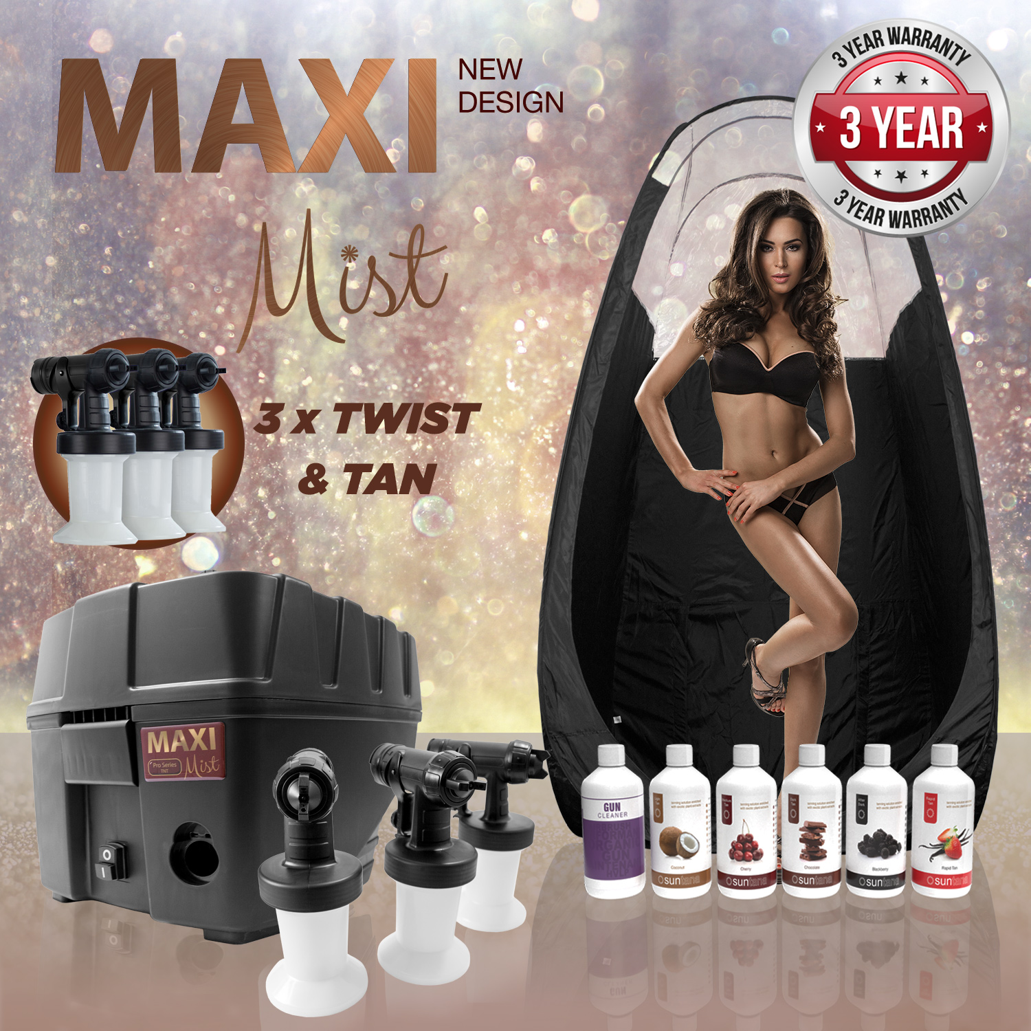 With an improved ergonomic handle with comfort-grip and a unique patented split gun system, “Twist N Tan” enables fast solution changes for the busy tanner, no fussing with extra cups and lids.The MaxiMist™ Pro TNT includes 3 Spray heads!